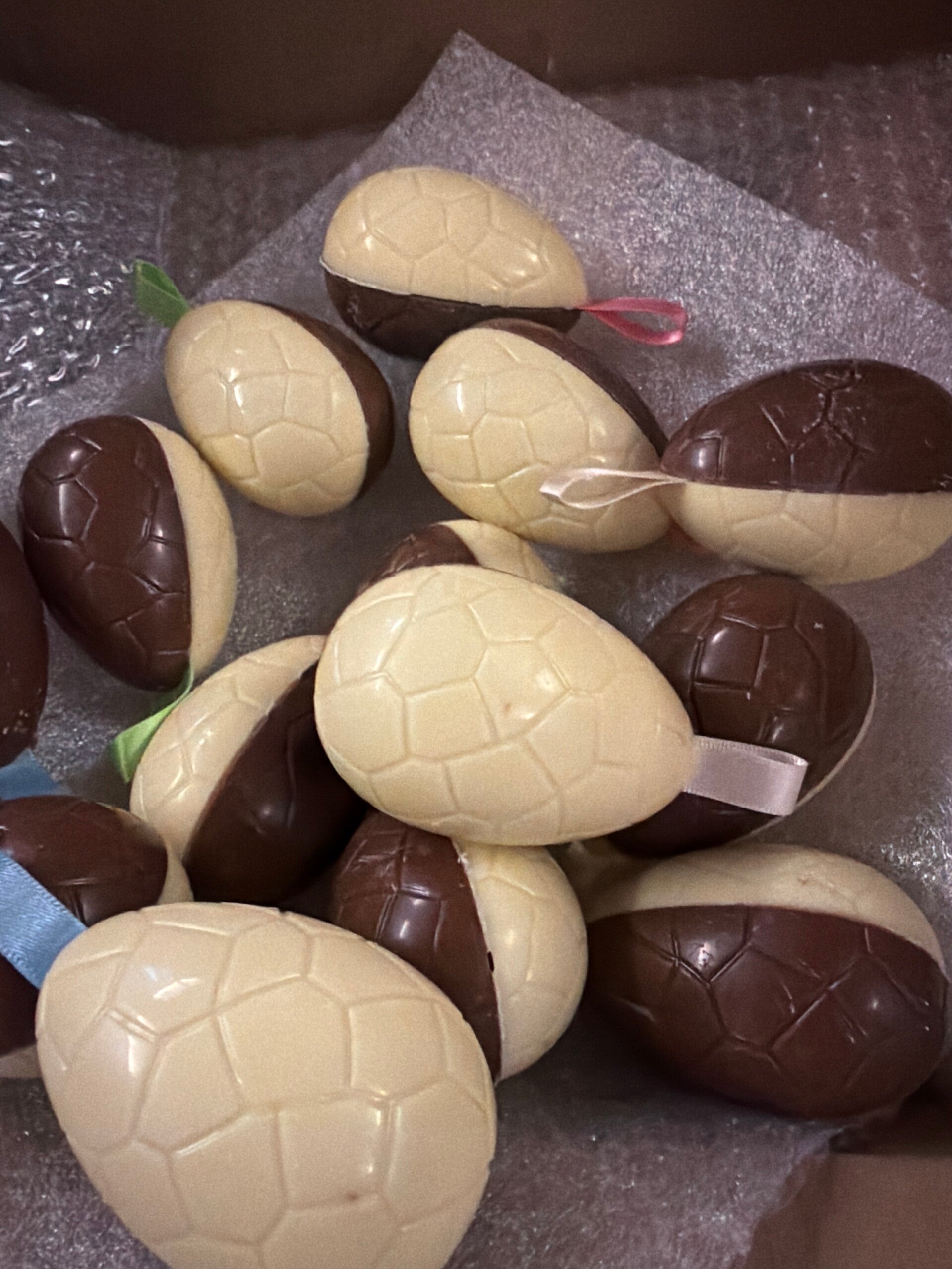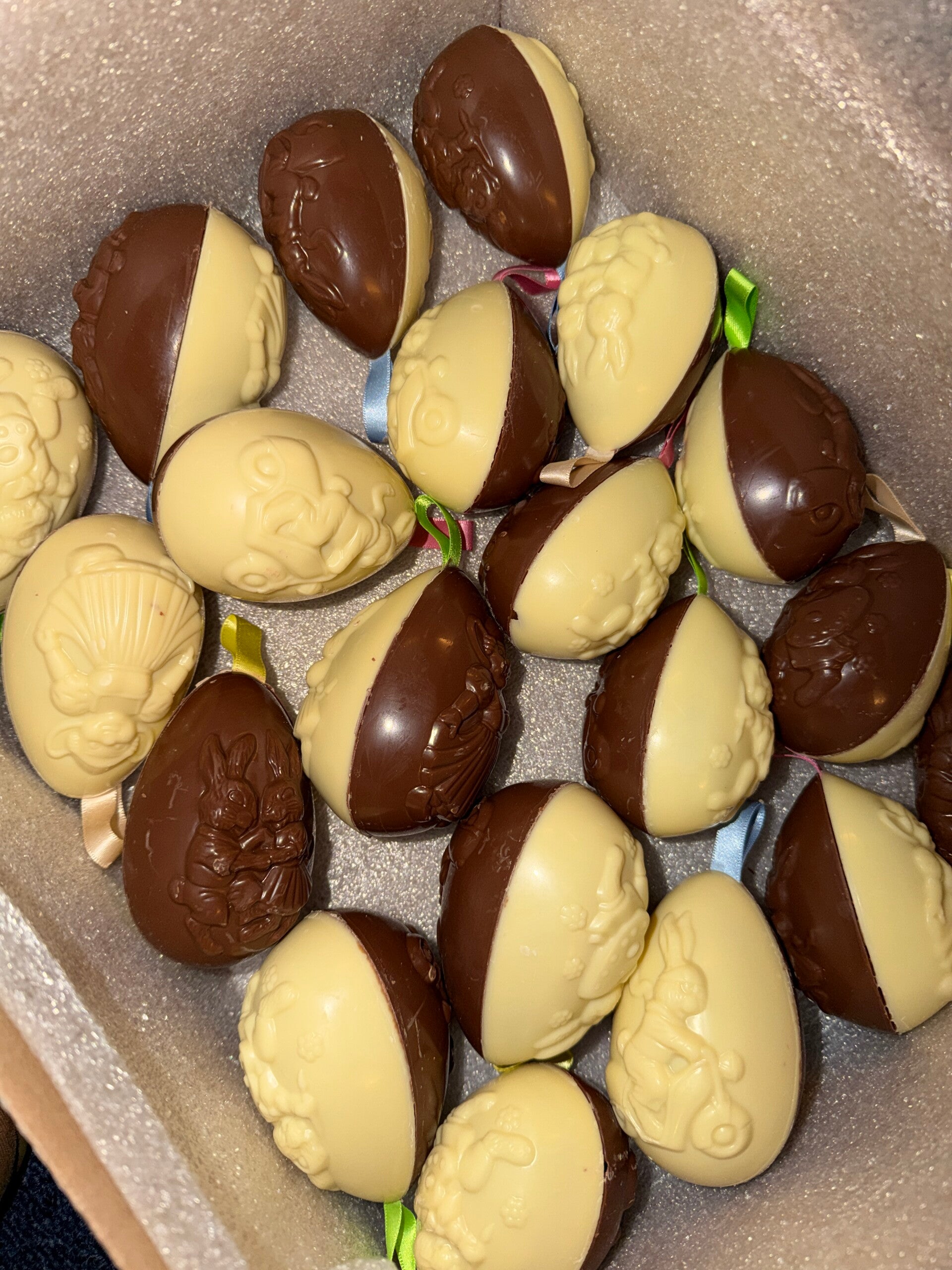 Een divers assortiment half melk half witte eieren met een gekleurd lintje. In de eieren zitten mini lentilles (7 tot 9 cm – 55, 45 – 30gr)